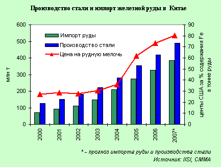 Напомним, что еще в 2003 г. Китай перегнал Японию по объемам закупок железной руды из-за увеличения производства автомобилей, бытовых приборов и расширения строительства. А в 2006 г. китайская Baosteel первая (и впервые!) на ежегодных переговорах установила новую цену на руду на 2007–2008 финансовый год.