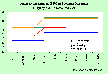 Экспортные цены на российское и украинское ЖРС аналогично внутренним сохранились на высоком уровне за счет стабильной конъюнктуры мирового рынка проката, высокого уровня производства чугуна в Европе, устойчивого спроса на железную руду на европейском и китайском рынках, а также действия долгосрочных контрактов между производителями и потребителями ЖРС.