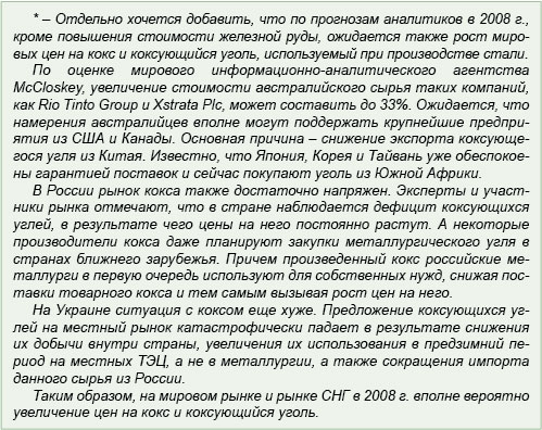 Таким образом, учитывая все предпосылки, сложившиеся на мировом рынке железной руды в преддверии новых ценовых переговоров, в 2008 г. стоимость железорудного сырья однозначно вырастет.