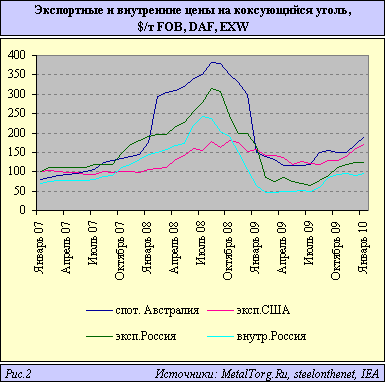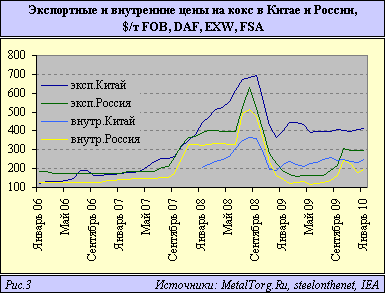 Отметим, что с августа 2009 г. двинулись вверх и китайские внутренние цены на местный коксующийся уголь – в среднем до $193,5 за т в конце лета, до $197 за т в декабре и до $205–212 за т в начале января 2010 г.