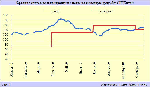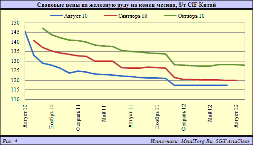 К примеру, в результате наметившейся тенденции роста спотовых цен в последние месяцы на рынке своповых контрактов также произошло повышение стоимости руды. Так, если еще в конце августа 2010 г. цены на железорудные свопы для октября текущего года составляли $128,83 за т (-$0,67 к концу июля), то в последний день сентября они поднялись до $137,17 за т (+$8,4), а 20 октября своп-цена составила $147,17 за т (+$10).