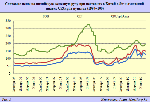 Причем, подтверждая китайскую позицию, спотовые цены на железную руду давно и неплохо действительно коррелируют именно со стальными ценами (рис. 2).