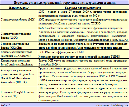 Клиринг свопов (безналичные расчеты между банками, очистка от пошлин) биржи проводят с опорой именно на индекс спотовых цен руды. А сделки по железорудным свопам уже осуществляются на весьма многих площадках (табл. 1).