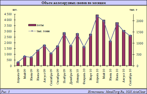 В июне спад продолжился – SGX провела клиринг 2183 лотов, что эквивалентно приблизительно 1,1 млн т железной руды стоимостью около $150 млн. В июле последовал пик, далее, в августе-сентябре, – спад, невзирая на рост выпуска стали и импорта руды в КНР. Растущее потребление было замечено «торговцами» только в октябре: объем сделок вернулся на уровень августа текущего года (рис. 3).