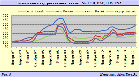Фактические экспортные котировки китайского кокса значительно (в среднем на $110 за т) превышают аналогичные российские цены. Однако это связано с тем, что в экспортных китайских ценах заложена 40%-я вывозная пошлина (действующая с 2008 г.), без которой стоимость сырья из КНР при отгрузках на внешний рынок оказывается ниже экспортных цен России (в 2010 г.) в среднем на $30 за т, хотя диапазон различий месяц к месяцу колеблется от $8 до $80 за т.