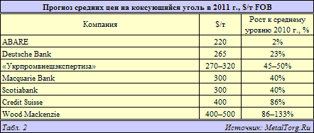 Прогнозы последних месяцев, которые были собраны к этой статье, частично уже успели устареть. Специалисты австралийской ABARE, например, в своем декабрьском отчете предсказывают всего 2%-й рост средних квартальных цен на металлургический уголь в 2011 финансовом году, до $220 за т FOB. Однако более свежие оценки, озвученные в январе–феврале текущего года, превышают предыдущие на 11–25% и предполагают рост цен до $300–500 за т (табл. 2).