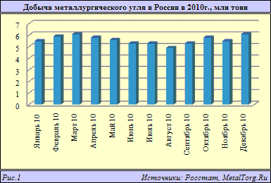 По данным различных источников (Росстата, ФГУП «ЦДУ ТЭК», ЗАО «Росинформуголь», а также согласно данным компаний), добыча углей для коксования (коксующихся, металлургических) в РФ в 2010 г. выросла на 6,5–9,9%, до уровня около 65 млн т.