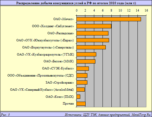 В результате по итогам 2010 г. группа «Мечел» сообщила, что увеличила производство концентрата коксующегося угля на 52% по сравнению с 2009 г., до 11,5 млн т. Отметим, что добыча углей «Мечелом» выросла еще заметнее. Группа уверенно вышла на первые позиции в этом российском производстве (рис. 3).