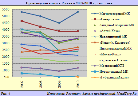 По данным Росстата, производство кокса в 2010 г. в РФ увеличилось на 8,4%, до 29,74 млн т, практически полностью закрыв спрос металлургии (рис. 4).