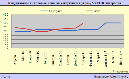 Российский производитель коксующегося угля группа «Мечел» в 2011 г. ожидала 30%-го роста цен. Однако первые контракты на II квартал 2011 г. уже заключаются на уровнях около $330 FOB, т.е. с 50%-м подорожанием. А прогнозы на вторую половину года становятся все более расплывчатыми.