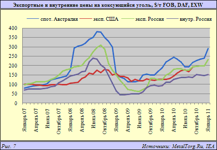 Бурной динамике спотовых цен на австралийский коксующийся уголь с некоторым запозданием следовали цены США и России (рис. 7).