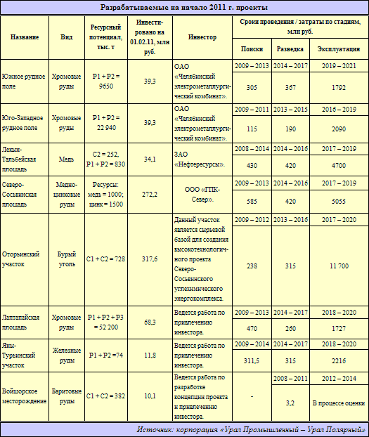 Однако инфраструктура нужна в конечном итоге, чтобы обслуживать интересы потребителей и добывающих компаний. А с этой стороны у «Урала Промышленного – Урала Полярного» все не слишком хорошо: из оптимистично заявленных восьми проектов по половине инвесторов совсем нет (т.е. в месторождении никто не заинтересован), а по трем из четырех оставшихся заинтересованность компаний есть, однако инвестсоглашения так и не заключены, чем в октябре 2011 г. был сильно недоволен гендиректор корпорации Александр Белецкий. Неудивительно – ЧЭМК (хромовые руды) вложил в поисковые работы меньше 20% от намеченного объема инвестиций, а ЗАО «Нефтересурсы» (медные руды) – еще вдвое меньше. Единственной обязательной компанией на этом фоне выглядит «ГПК-Север», потратившая на поиски почти половину от намеченного, но надо учитывать ее профиль – геологоразведка. А следовательно, дальнейших трат можно ждать только в том случае, если она найдет покупателя на уже разведанные запасы.