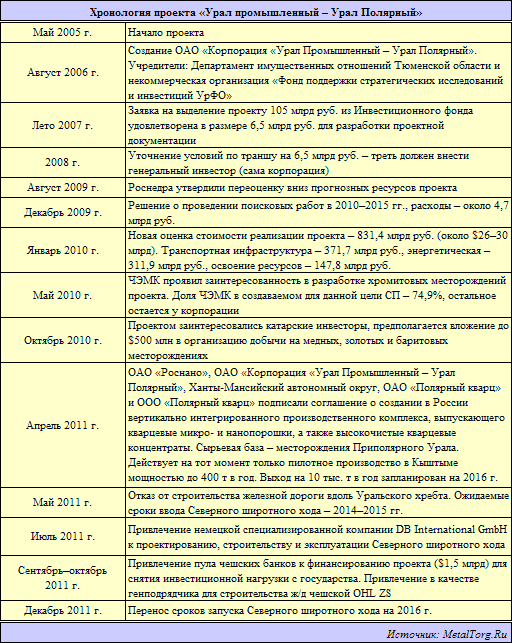 Весь проект был затеян как бы в целях освоения «природных богатств Приполярного Урала». Чиновники дружно говорили о колоссальных запасах железных и хромовых руд, обещали залежи молибдена, кварца, титана и многого другого. Ради этого было запланировано буквально титаническое строительство: железная дорога по восточной стороне Уральских гор с юга на север до Салехарда протяженностью более 700 км, где она поворачивает на восток и идет еще 700 км в направлении Нового Уренгоя (Коротчаево – Новый Уренгой – Надым – Салехард – Обская – Полуночное). Стоимость проекта превышала 310 млрд руб., ввод в эксплуатацию был намечен на 2013–2015 гг. Также планировалось строительство автомобильной дороги, соединяющей Ивдель Свердловской области с границей Ханты-Мансийского округа.
