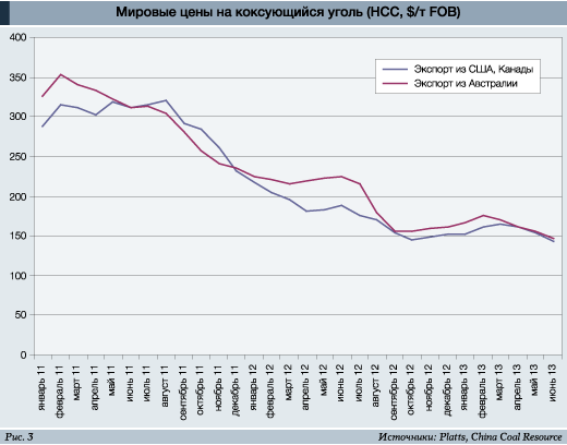 В итоге мировые цены на коксующийся уголь в 2013 г. продолжили свой спад как на спотовом, так и на контрактном рынке.