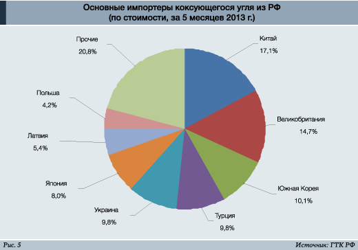 В текущем году произошло некоторое перераспределение доли импортеров этого угля. По итогам 5 месяцев заметно сократились объемы поставок в Турцию (-15,8% к аналогичному периоду прошлого года) и стоимость поставок на Украину (-32,5%) (рис. 5).