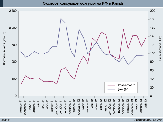 Ситуацию с российским экспортом коксующегося угля в 2013 г. продолжает «вытягивать» Китай, однако цены и объемы этих поставок остаются далеки от ожиданий наших угольных компаний (рис. 6).