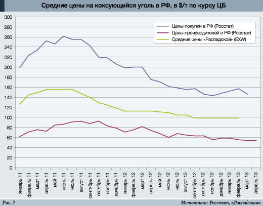 Причем, в отличие от рынка металлургического сырья, в российской металлургии в 2013 г. идет опережающий спад экспорта стальной продукции по сравнению с отгрузками на внутренний рынок. Это следствие сравнительно высоких экспортных цен полуфабрикатов и металлопроката РФ, уступающих, например, Китаю и Украине, а порой – и ряду восточноевропейских стран. Одна из причин этого – завышенные внутренние цены на металлургическое сырье, включая коксующийся уголь (рис. 7).