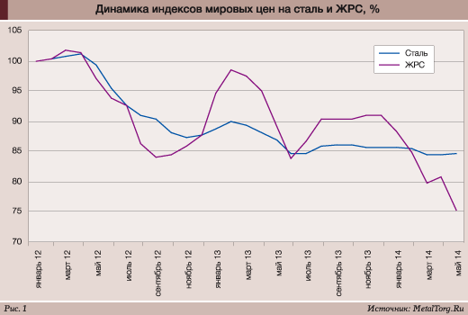 На избыток запасов косвенно указывают и стремительно падающие котировки железорудного сырья (ЖРС), существенно опережающие по темпам снижения стальные цены (рис. 1).