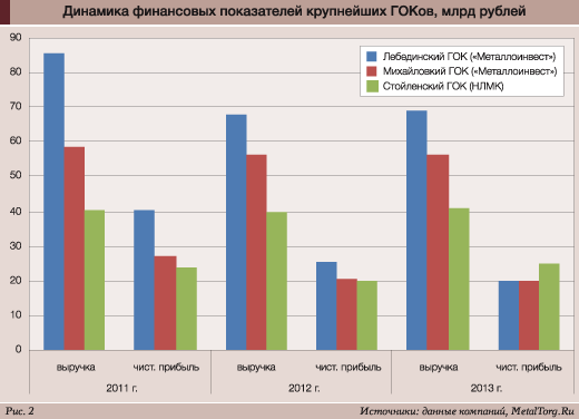 Крупнейшая отечественная железорудная компания – «Металлоинвест» – владеет Михайловским и Лебединским ГОКами. За 2013 г. в сумме они получили более 125 млрд руб. выручки и 39,5 млрд руб. чистой прибыли. Но стоит отметить, что, помимо очевидной причины падения доходов – снижения рыночных цен, налицо падение рентабельности работы: при относительно стабильной выручке и доходах от продаж чистая прибыль отчетливо идет вниз как в абсолютном, так и в относительном выражении, сократившись за 2011–2013 гг. в рублях в 1,7 раза, а в доле выручки – с 46 до 31%.