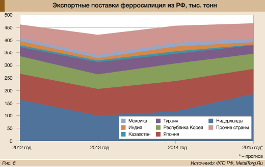 Как бы то ни было, ограничение доступа дешевой российской продукции на европейский рынок сыграло свою роль – цены там быстро поднялись на те же 20%. Что любопытно – никак не повлияв на распределение экспортных потоков отечественного ферросилиция (рис. 6).