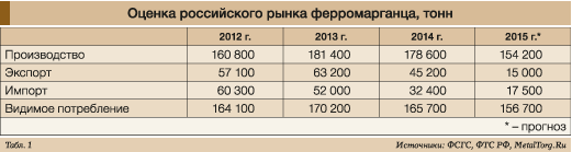 Начнем с ферросплава, показавшего наихудшие результаты, – ферромарганца. По предварительным оценкам, его производство в России в 2015 году сократится на 13–15%, причем это худший результат за последние годы (табл. 1).