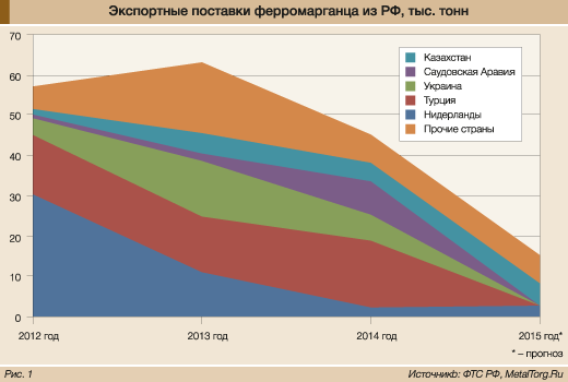 Экспорт ферромарганца из РФ пострадал еще сильнее: если в 2012 году половина его шла через Нидерланды, четверть – в Турцию и примерно 10% – в Украину, то уже в 2014 году от голландского направления осталось всего ничего, а еще через год пропали и поставки в Турцию (рис. 1).