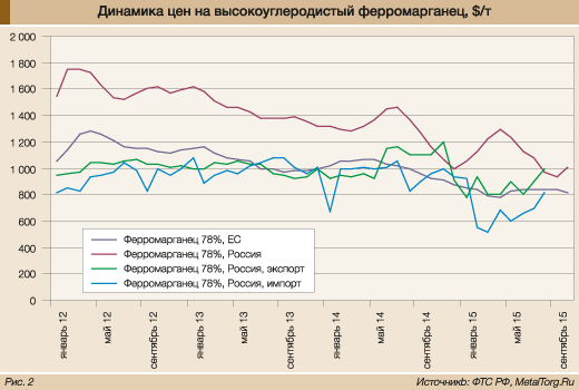 Что любопытно, обрушение рубля не обвалило цены предложения при поставках ферромарганца из России – скорее, они вновь поднялись на общеевропейский уровень. При этом ввозить мы пытаемся гораздо более дешевую продукцию – по $500–600 за т (рис. 2).