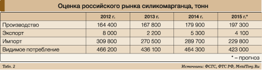 Справедливости ради от MetalTorg.Ru отметим, что официальная статистика ФТС РФ дает несколько иные цифры – украинская доля поставок силикомарганца определяется как 52% в 2012–2013 годах и 60% – в 2014 году от объемов всего импорта товаров с кодом ТН ВЭД 7202300000.