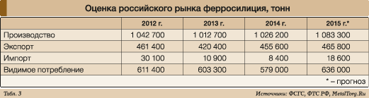 Ферросилиций в нашей стране выпускает гораздо больше заводов, чем марганцевые сплавы. Крупнейшие – ЧЭМК, «Кузнецкие ферросплавы» (включая Юргинский ферросплавный завод), Серовский ферросплавный завод, Братский ферросплавный завод, НЛМК и другие. Но у этого рынка есть любопытная черта – первые три предприятия входят в одну группу – «Ариант». На их долю приходится около 860 тыс. т годового производства ферросилиция в стране, т.е. они занимают порядка 80% рынка (табл. 3).