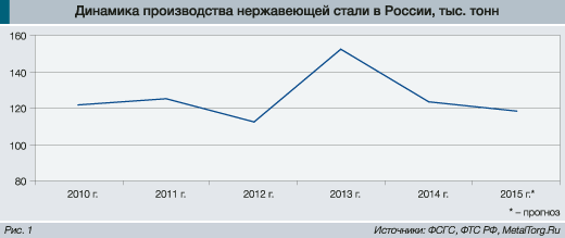 Однако с развалом Советского Союза выяснилось, что значительная часть технологий, которым нужен хром, оказалась неконкурентоспособной по сравнению с иностранными. Производство подшипниковых сталей, легируемых хромом, резко сократилось, продолжало падать все постсоветское время и после 2008 года обвалилось совсем. Внутренние потребители нержавейки также исчезли, у зарубежных были свои проверенные поставщики, и непредсказуемая российская продукция оказалась им не нужна. В итоге объемы выпуска нержавейки в России сократились в несколько раз и уже более 10 лет держатся в интервале 100–150 тыс. т в год (рис. 1).