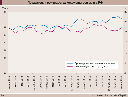 За 2015 год общее производство коксующегося угля в России выросло на 9,17%, до 81,9 млн т, а в январе 2016 года – до 7,17 млн т, что на 15,5% выше, чем годом ранее.