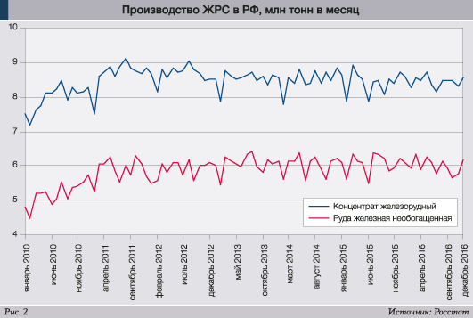 В то же время общероссийское производство железной руды в последние годы выглядит сравнительно стабильным (рис. 2).