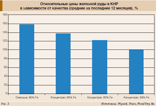 Причем в последнее время разница китайских цен на железную руду в зависимости от ее качества существенно подросла и приблизилась к отметке 60% (рис. 3).