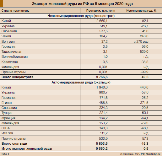 Так что пока, невзирая на пандемию, конъюнктура китайского железорудного рынка останется весьма выгодной для производителей и экспортеров, включая российских поставщиков. И естественно, что наши поставки железорудного концентрата в Китай (+82%), особенно окатышей (рост в 4,4 раза), в текущем году существенно выросли (см. табл. 1).