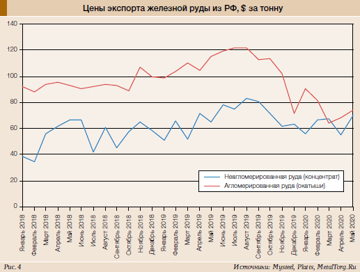 Их нехватка на российском рынке ранее частично покрывалась поставками окатышей ССГПО (Казахстан) на ММК. Но в последние годы этот импорт сократился ввиду значительного роста казахстанских цен ЖРС. Тем обиднее спад цен наших экспортных поставок на агломерированную железную руду (окатыши и агломерат) с осени прошлого года (рис. 4).