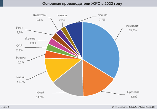 Мировое производство железорудного сырья (ЖРС), по оценке Геологической службы США (USGS), в 2022 году снизилось на 2,9% и составило около 2,6 млрд т руды (фактически – концентрата и прочей товарной продукции с содержанием Fe 65%). Совокупная стоимость продаж несколько снизилась, но осталась выше $300 млрд. Основные производители – игроки глобального рынка ЖРС – также не изменились (см. рис. 1).