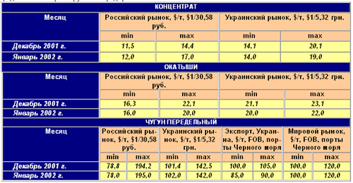 Ситуация на рынке горно-металлургической продукции в январе 2002 г. Железнорудное сырье Российский рынок – нет общей тенденции по ценам на железорудное сырье. Концентрат подорожал на $2-3/т, а окатыши подешевели на столько же. Это связано с конъюнктурными особенностями российского рынка железорудного сырья, на котором наблюдается повышенный спрос украинских производителей металла на концентраты российского производства, качество которых выше концентратов украинского производства, а также относительно стабильный спрос на окатыши.
