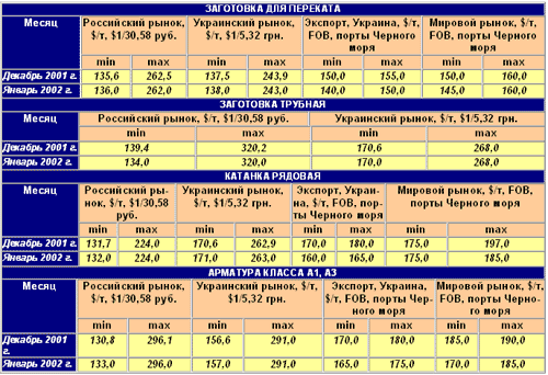 В январе 2002 г. на рынках металлопродукции наметилось оживление. Хотя цены на многие виды продукции в основном снижались из-за того, что производители и трейдеры избавлялись от прошлогодних запасов продукции, можно отметить увеличение оптимистических прогнозов. Прошлый год заставил многих производителей металлопродукции во всем мире реструктуризировать производство, выводить излишние мощности, разрабатывать программы дальнейшего уменьшения избыточного производства. Введение антидемпинговых мер на рынках США и Западной Европы, при всем негативном их влиянии на российских и украинских производителей, положительно сказалось на “расчистке” этих рынков от излишков металлопродукции. К началу 2002 г. несколько ослабевает давление излишних объемов продукции на рынки металла, и на второе полугодие 2002 г. аналитики прогнозируют начало выхода из мирового экономического кризиса.
