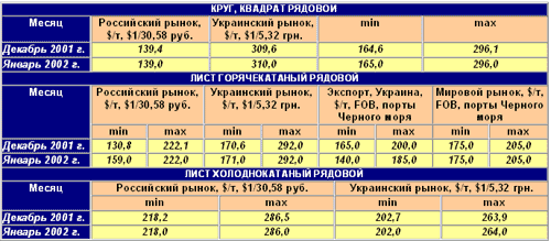 Плоский прокат. На российском и украинском рынках – некоторое оживление на рынках стали и попытки поднять цены, что является скорее психологическим ходом в начале нового года. Производители устали от постоянного снижения цен и депрессивных ожиданий, а цены достигли минимального уровня. На мировом рынке цены находятся на очень низком уровне и практически не менялись. Однако листовая сталь украинского производства еще более подешевела – понижение цен составило около $15 на тонне. Но производители ожидают в ближайшем будущем некоторого подъема цен, что связано в основном с отменой системы лицензий на импорт стали с 1 апреля 2002 г. Китаем, который в ноябре 2001г. стал членом ВТО. Кроме то-го, в США появились первые признаки завершения экономического спада.