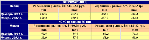 Кокс. На российском рынке – увеличился разбег цен – в начале года производители пытаются определиться с потребностями и возможностями покупателей. На украинском рынке – цены снизились, в основном, из-за ухудшения качества кокса – увеличилась доля кокса, производимого из рядовых марок углей.