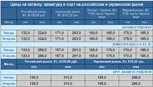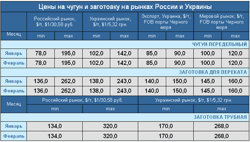 Заготовка На российском и украинском рынках цены за месяц не изменились, разбег цен довольно большой, что и приводит к относительной стабильности на этих рынках. На мировом рынке цены также не изменились, однако аналитики прогнозируют повышение цен в связи с ожидаемым оживлением в мировом производстве стальной продукции.