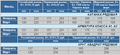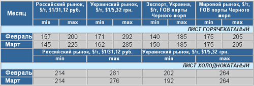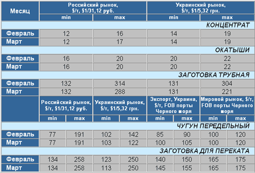Чугун и заготовка На российском рынке цены за месяц не изменились (график 1). На украинском рынке снизился “разбег” цен, это происходит из-за того, что реально цены на чугун начали повышаться, но при этом предприятия, которые в предыдущие периоды выставляли наиболее высокие цены, в марте их снизили, приближая к среднеотраслевому уровню. Например, повысили цены на чугун в марте: ОАО "ДМЗ им. Петровского" - с 575 до 600 грн./т, без НДС; ОАО "ЗМК "Запорожсталь" - с 541 до 551 грн./т, без НДС. Снизило цены на чугун в марте ОАО "ДМК им. Дзержинского" - с 756 до 580 грн./т, без НДС.