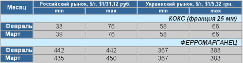 На российском и украинском рынках ферромарганца цены практически не изменялись, не считая увеличения “разбега” цен на российском рынке. Поставки ведутся в основном по договорам, заключенным в начале года. Мировой рынок – на рынках Европы и США цены также остаются практически неизменными и, по прогнозам аналитиков, вряд ли повысятся, по крайней мере, до конца второго квартала текущего года.