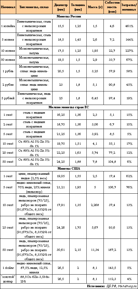 Отметим, что в отличие от России, химический состав сплавов, использующихся для выпуска монет в ЕС и США, точно и широко известен. Чем, кстати, не преминули воспользоваться западные экономисты – они подсчитали, что изготовление каждого металлического доллара образца 1971 г. («Эйзенхауэровский доллар») обходилось казне США в 8 центов, но с введением монеты образца 1979 г. («доллар Энтони») было успешно снижено до 3 центов (в ценах того времени). Эта оценка касается только стоимости материалов, поскольку полная себестоимость выпуска монет не афишируется и на Западе.