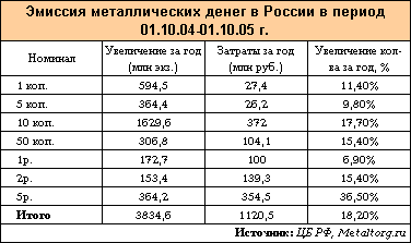 Опираясь на статистику ЦБ РФ, достаточно легко определить объем металлической денежной массы «на руках» и годовую эмиссию. Согласно отчетам ЦБ РФ от 01 октября 2004 и 2005 гг., количество монет за этот период выросло с 21,1 млрд экз. до 24,9 млрд экз.
