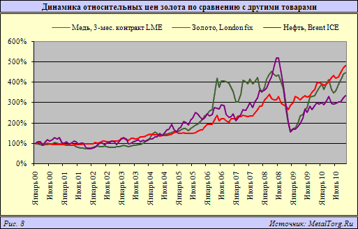 В то же время многие крупные фигуры Уолл-стрит, включая самого удачливого спекулянта в мире Джорджа Сороса, говорят сейчас о «пузыре» на рынке золота. Фактически речь идет о необоснованном росте цен одного актива относительно других. Однако на фоне цен других популярных биржевых товаров (нефти, меди и т. д.) этот «пузырь» уже выдохся (рис. 8). Тем более что с долгожданным полновесным оживлением мировой экономики цены на сырье поднимутся еще выше.
