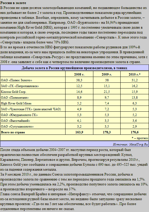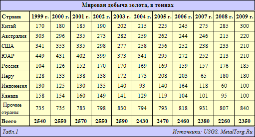 Абсолютным значениям добычи, которые приводят главные авторитеты отрасли – USGS, WGC и GFMS, – можно верить с некоторой натяжкой. Так, например, за 2009 г. специалисты USGS насчитали 2350 т добытого золота (+4% к 2008 г.), в WGC сочли, что с учетом хеджирования поставок производителями этот показатель составил 2327 т (+13% к 2008 г.). Если же считать объем добычи напрямую, то у WGC получилось 2579 т (+7% за год) – на 7 т и 0,2% больше, чем аналогичная цифра GFMS.