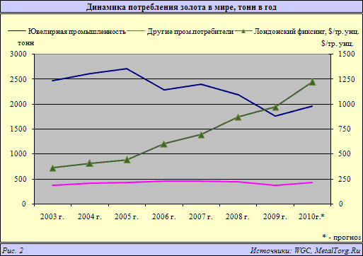 Среди промышленных потребителей более или менее стабильно дела обстоят только в электронной индустрии, но с началом кризиса даже ее потребности в золоте резко пошли на спад. Остальные с новым витком роста цен начали урезать свои запросы на 4–5% ежегодно (рис. 2).