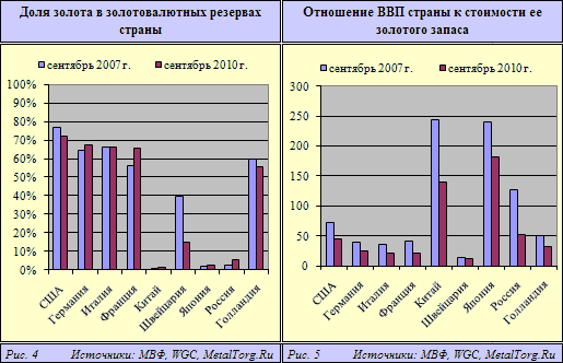 Россия, как и всякая развивающаяся страна, особо большого золотого запаса не имеет, однако его накапливает. Сейчас по отношению золота к ВВП мы в промежуточном положении, уступая лучшим азиатским экономикам, но превосходя многие европейские страны. Запас золота в золотовалютных резервах Центрального банка РФ с 1 января 2009 г. по 1 января 2010 г. вырос на 117,6 т (с 520 до 637,6 т), а к сентябрю 2010 г. достиг 726 т.