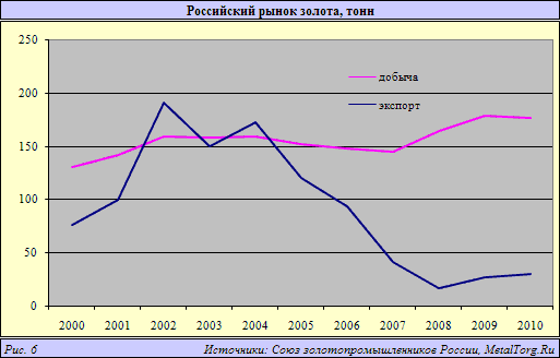 Что любопытно: наращивание золотого запаса России идет на фоне давно забытой тенденции. Последние 2 года вновь начался рост экспортных поставок золота, причем в 2010 г. прогнозируется уровень вывоза несколько выше 30 т (рис. 6).
